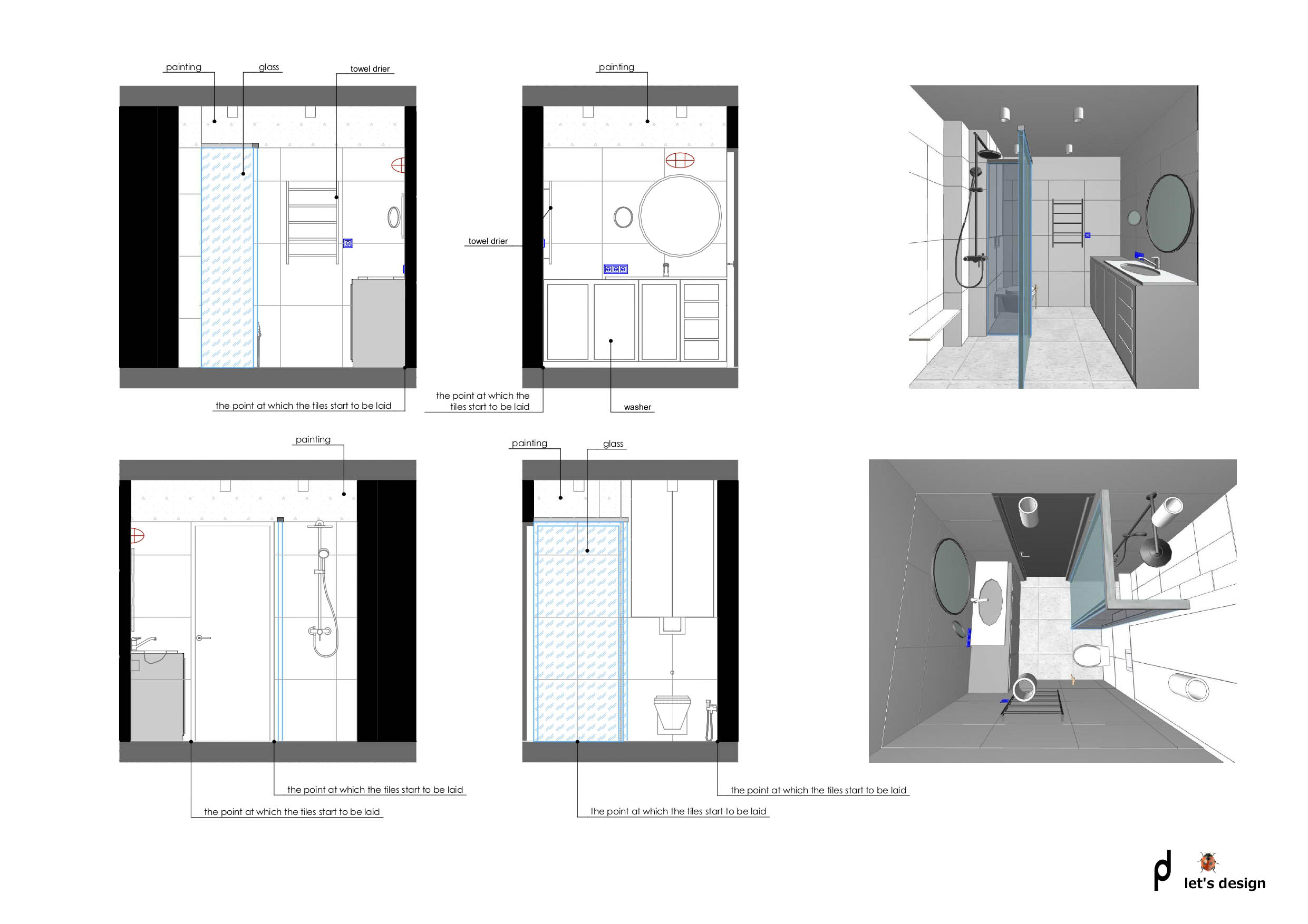 - Bathroom plan with interior elevations and sanitary fittings specs