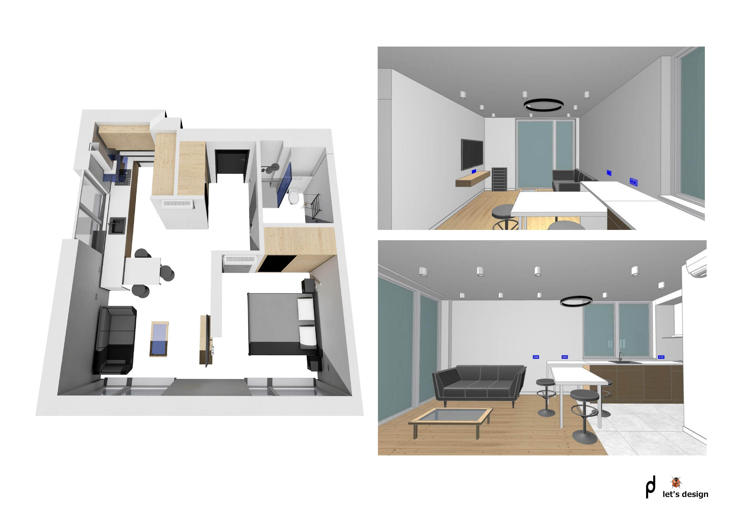 2. 3-d Model, a three demrntional plan to see space usage: arrangement of furniture, appliances, material combinations.